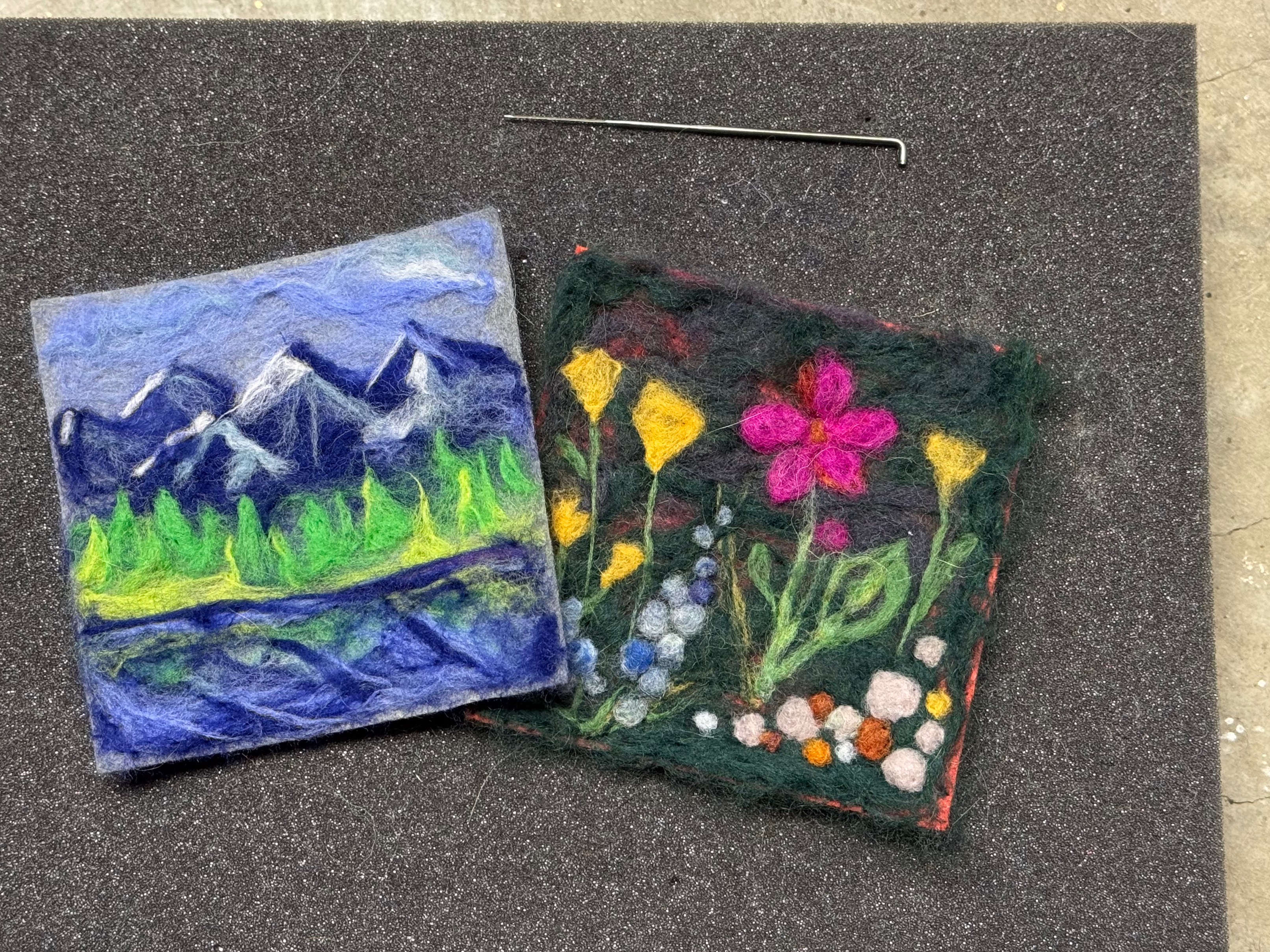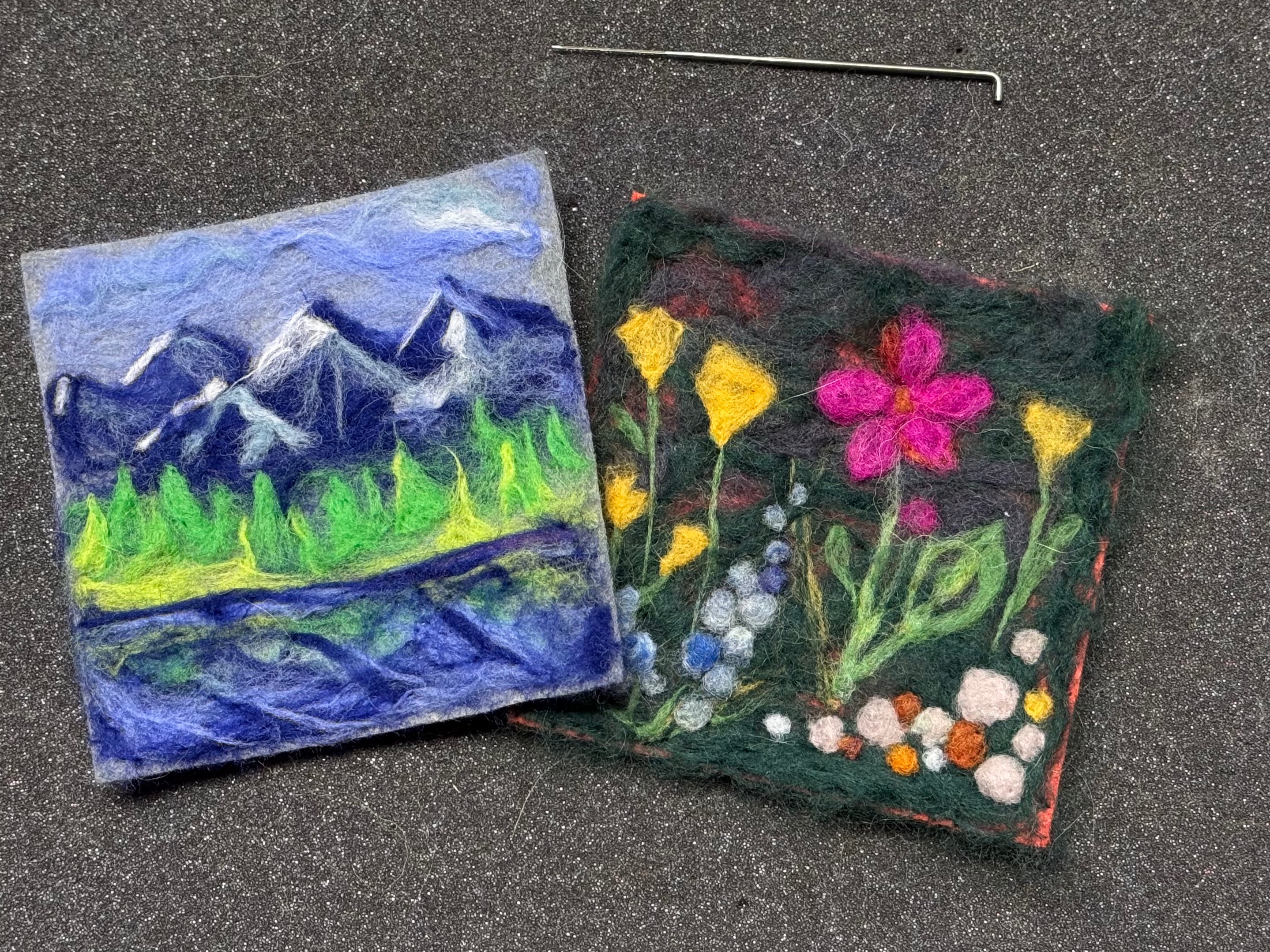 A needle felting class for all levels, creating a beautiful spring & nature-inspired felted artwork out of soft wool fibers. Felting is the process of matting, condensing, and compressing wool fibers together. Using special barbed felting needles, tufts of wool can be layered and assembled to form soft pictures and imagery. With colorful wool "roving" you will create a 5x7" landscape artwork to be placed in a matted 8x10 frame.
